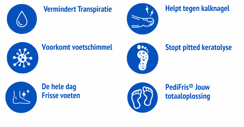 Door de zweetproductie effectief te reguleren en te combineren met de geurbestrijdende kracht van PediFris® Classic, voorkom je niet alleen geur, maar creëer je ook een vijandige omgeving voor schimmels en bacteriën.